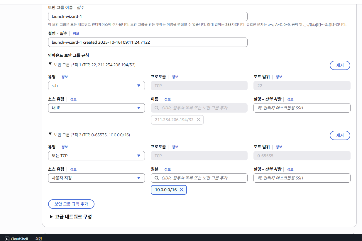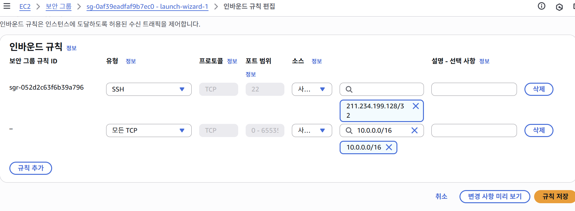 - 보안 규칙 설정 (이 인스턴스에 아무나 접근해선 안됨.)