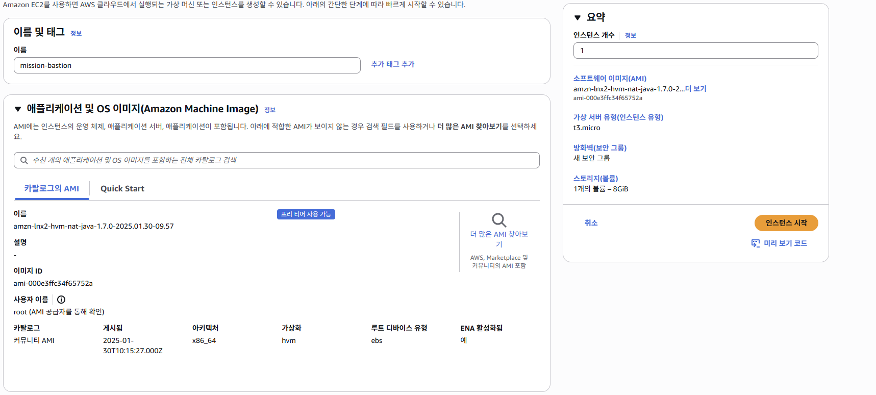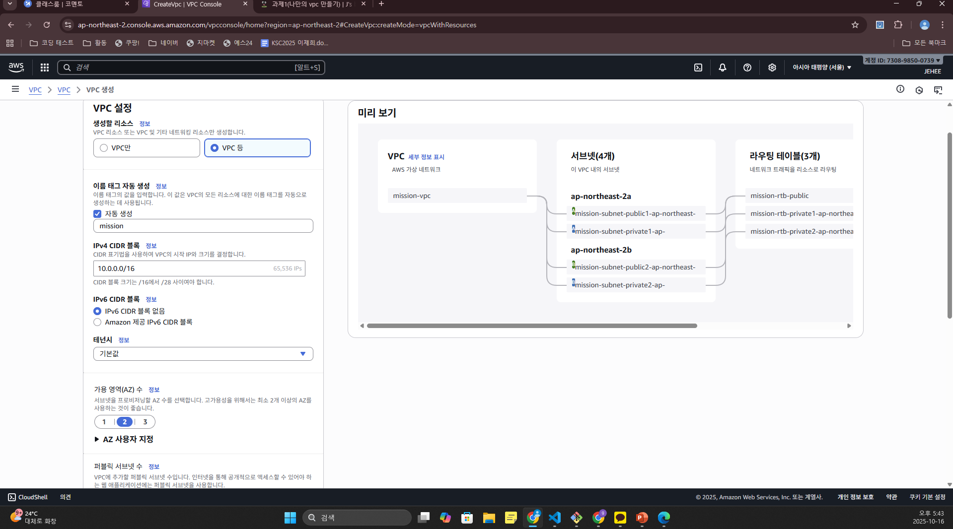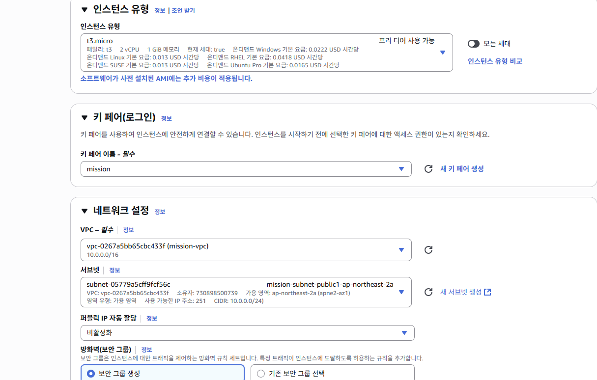 -> 인터넷 게이트웨이도 자동 생성 - VPC 이름: mission-vpc / ipv4 CIDR 블록: 10.0.0.0/16 (나머지는 디폴트)