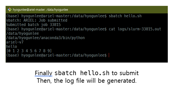 - srun으로 코드 잘 돌아가는지 확인 -> script 작성하고 shell 파일에 적고 sbatch로 제출