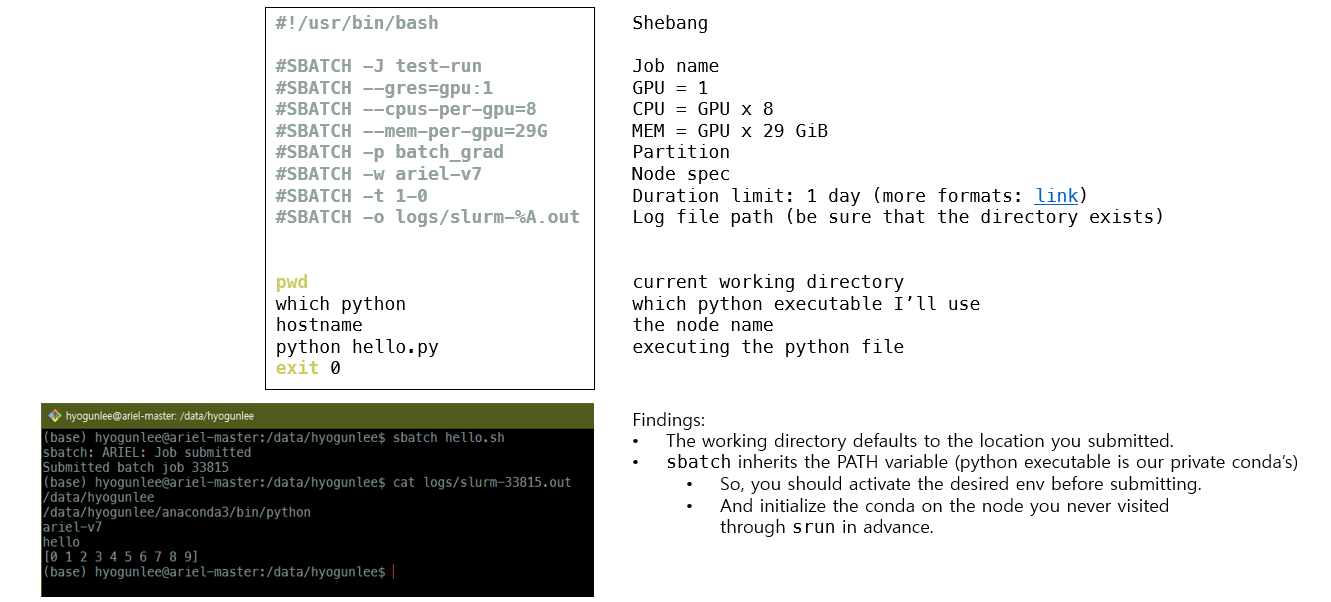 -> sbatch가 PATH라는 shell에 있는 variable을 상속받았다는 뜻. sbatch 하기 전에 python 환경 킨다음에 sbatch 하면 거기서도 이걸 환경으로 인식